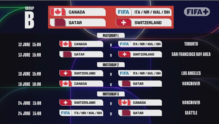 世界杯B组赛程:瑞士6月25日3:00对加拿大,14日3:00对卡塔尔