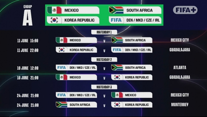揭幕战将在墨西哥首都墨西哥城的阿兹特克体育场进行,对阵双方将是东道主墨西哥与小组赛抽签中排在A2位置的南非。
