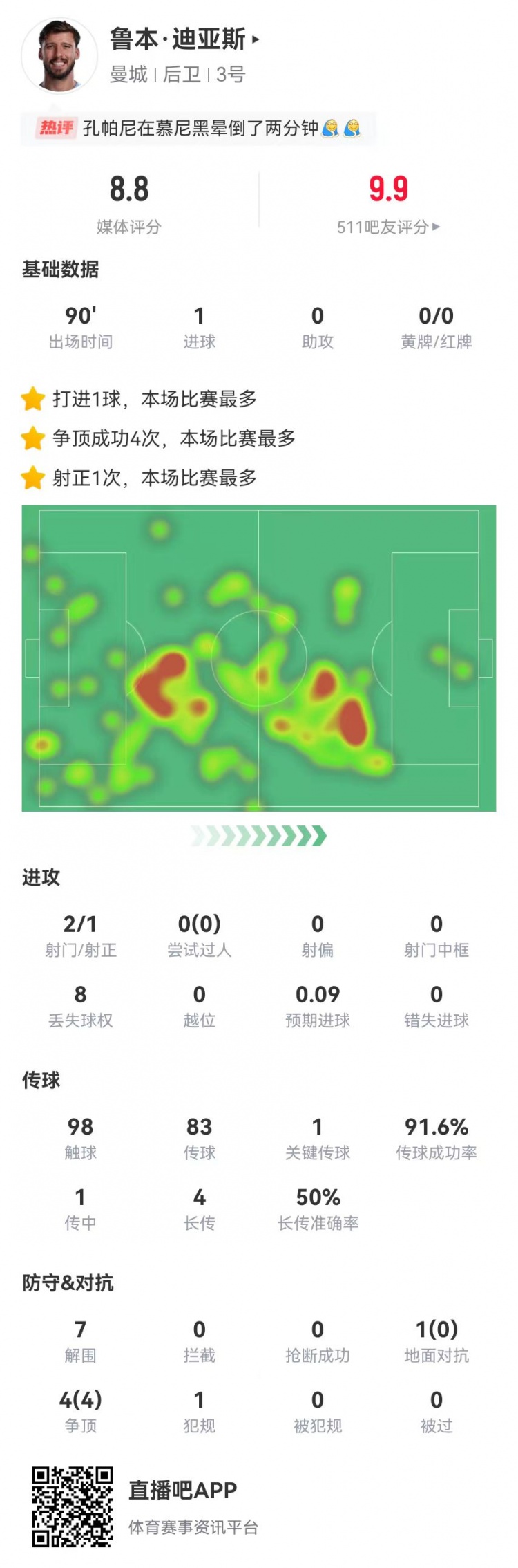 - 鲁本·迪亚斯本场1球+1关键传球 7解围+5对抗4成功 获评8.8分