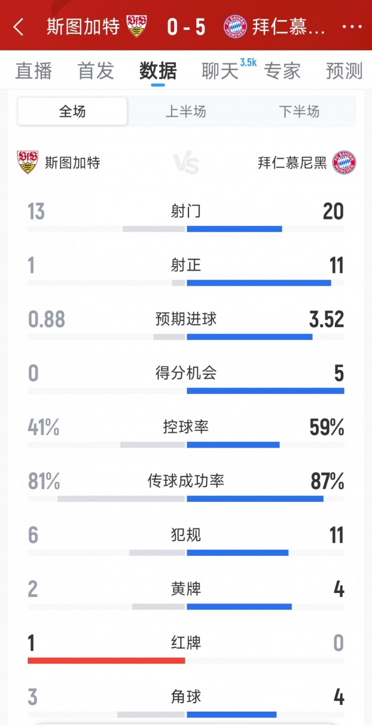 - 拜仁5-0斯图加特全场数据:射门20-13,射正11-1,得分机会5-0