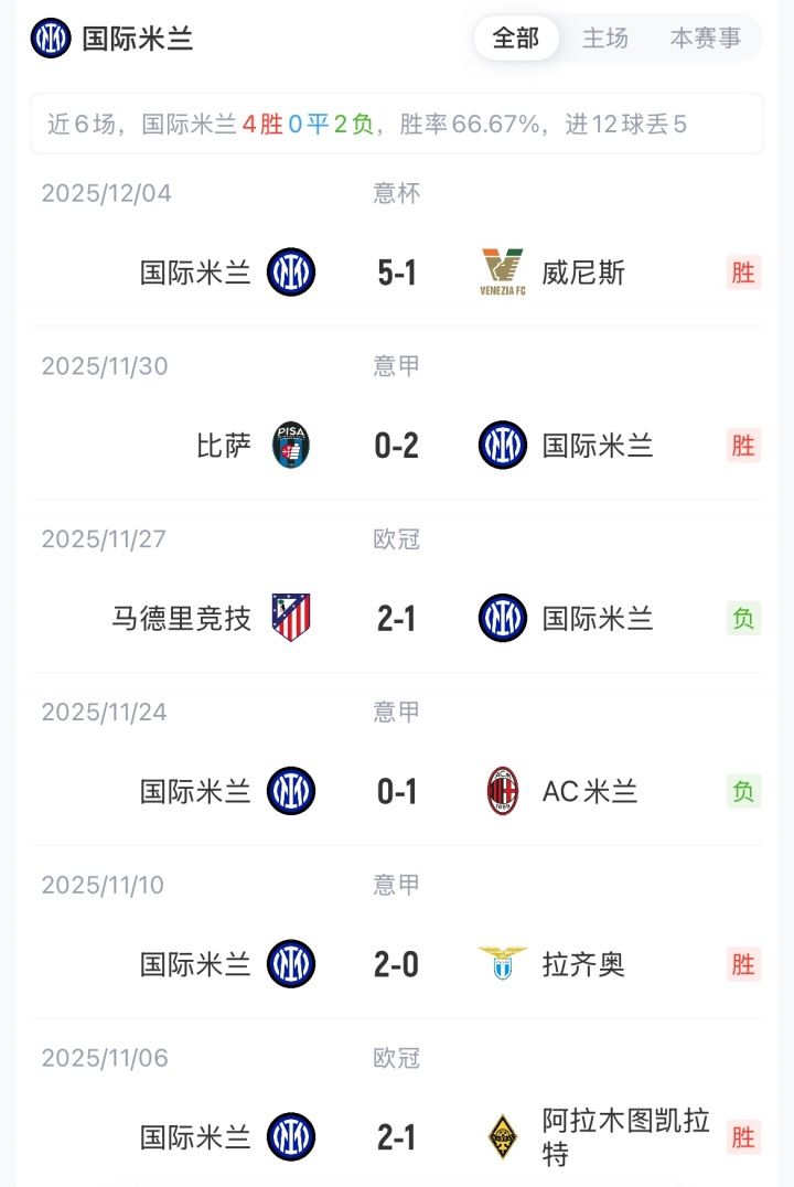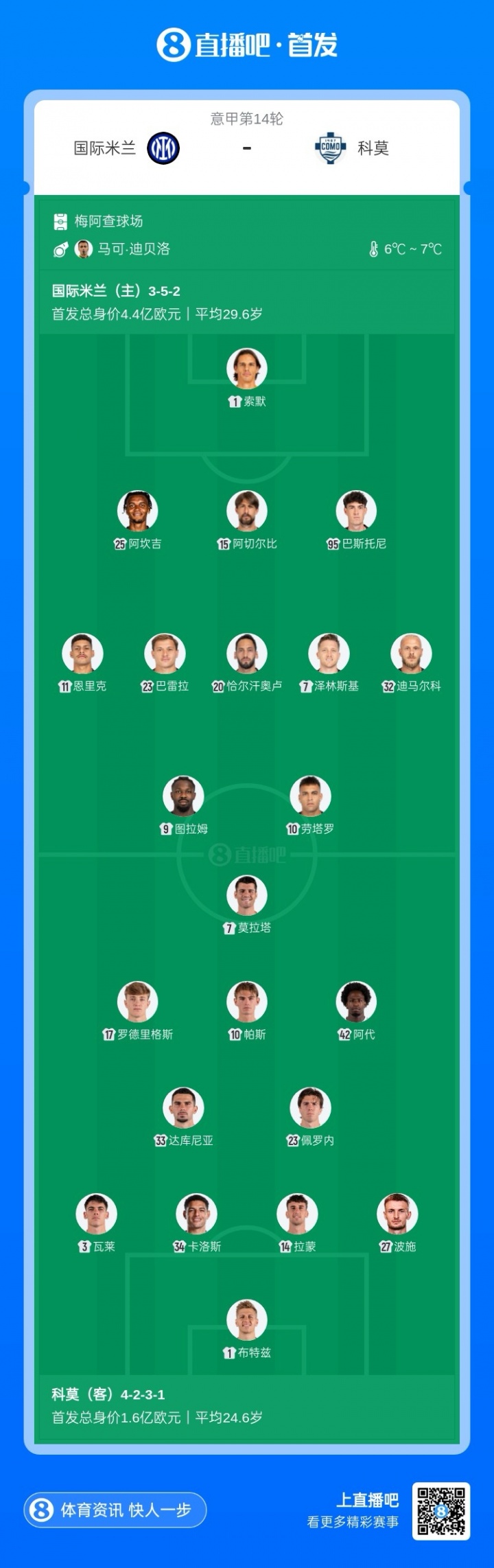 12月7日讯 意甲第14轮,国际米兰对阵科莫,赛前首发公布。