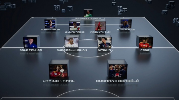 最佳阵容:多纳鲁马、阿什拉夫、帕乔、范戴克、门德斯、帕尔默、贝林厄姆、维蒂尼亚、佩德里、亚马尔、登贝莱