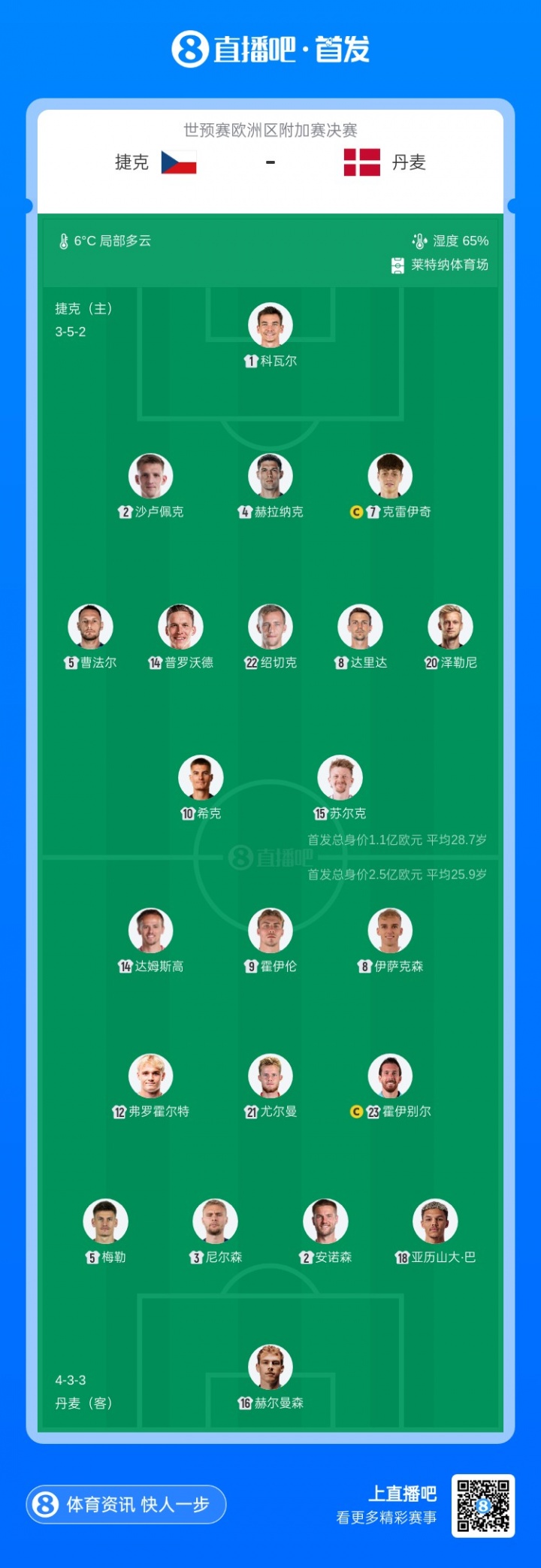 4月1日讯 北京时间4月1日凌晨2:45,世预赛欧洲区附加赛决赛,捷克vs丹麦。赛前双方公布了本场比赛的首发阵容。本场比赛的胜者将晋级美加墨世界杯正赛,败者将无缘世界杯。